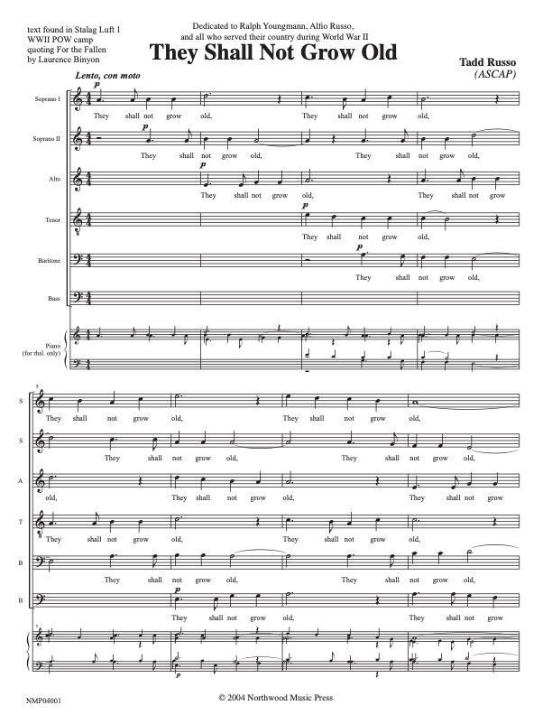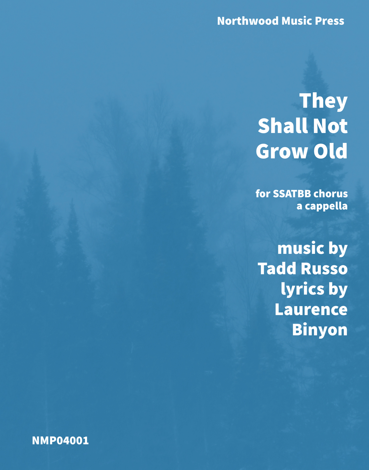 They Shall Not Grow Old is a setting of a stanza from For the Fallen by Lawrence Binyon. The poem was written for those who died in World War I, but I first encountered this text while looking through inscriptions found in World War II prison camps. They Shall Not Grow Old is set for SSATBB chorus a cappella and includes the additional words of the inscription in Stalag Luft I, "Lest we forget."
