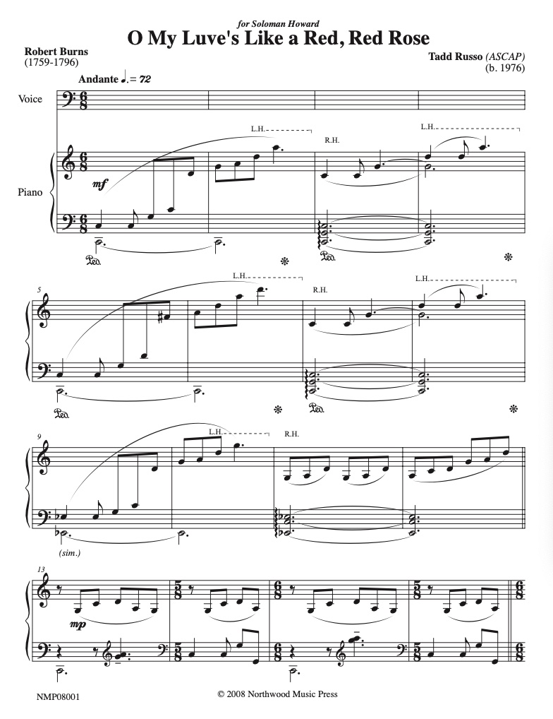 O My Luve's Like a Red, Red Rose was composed for Soloman Howard, Bass. The poem is a familiar one by the Scottish poet Robert Burns (1759-1796) in an entirely new setting.